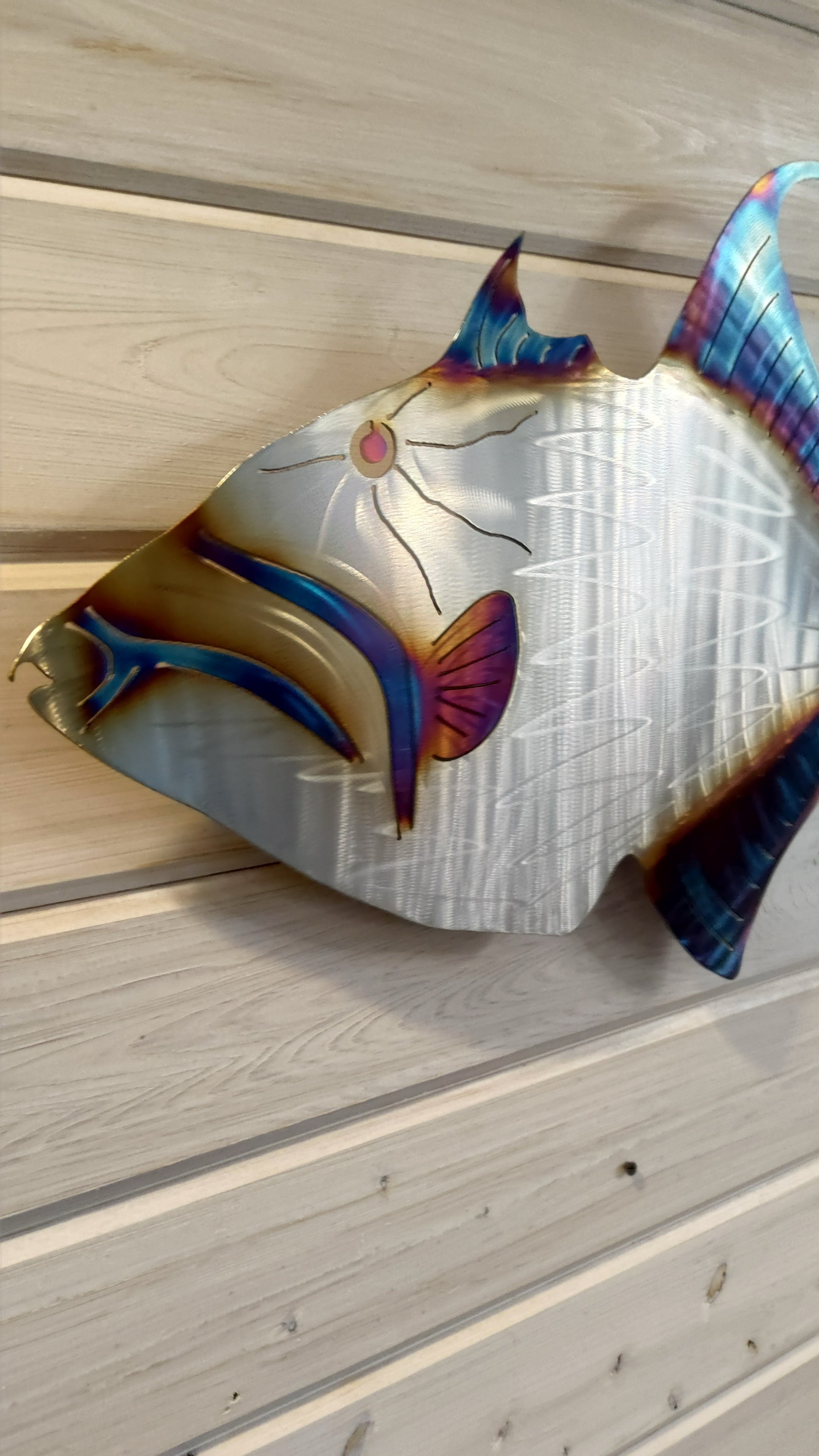 This Stainless steel Queen trigger fish is made of high quality 316 stainless steel that will always shine like new for many years. Has a 1" off set hanger welded on the back. Has a brushed and swirled finish. It is then blued/colored carefully with a torch. the different colors indicate the difference in temperature of the metal when it oxygen touches is. Every torched item is different in its own way.